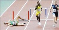 Llewellyn Herbert of South Africa falls at the final hurdle in the men's 400 metres hurdles final during the World Athletics Championships at the Stade de France in Saint-Denis yesterday. Felix Sanchez of the Dominican Republic won ahead of Joey Woody (right) of the US and Greece's Periklis Iakovakis was third. Danny McFarlane (centre) of Jamaica was fourth. - Reuters PARIS, France: