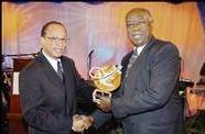 Dr. Vance Lannaman (right), whose vision was realised with the establishment of the Caribbean Maritime Institute, accepts an award from CMI Chairman Captain Hopeton DeLisser.