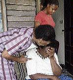 Left: Gregory Grant. Right: Jasmine Tharkurdeen (seated), grandmother of Gregory Grant, 18-year-old student of Copperwood, Bickersteth, St. James, is comforted by church sister Eunice Ramsay, while Trudy Ramsay looks on. Grant was shot and killed by gunmen in the community on Saturday along with Edward Cunningham, 19, also of a Copperwood address. - Photo by Monique Hepburn