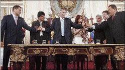 Leaders join hands, from left, Ecuador's President Rafael Correa, his Bolivian counterpart Evo Morales, Argentina's outgoing President Nestor Kirchner and his wife and President-elect Cristina Fernandez, Brazil's President Luiz Inacio Lula da Silva, his Paraguayan counterpart Nicanor Duarte Frutos and his Venezuela counterpart Hugo Chávez, after signing a founding document for the Banco del Sur (Bank of the South) a the Casa Rosada Government House in Buenos Aires on December 9. - Reuters