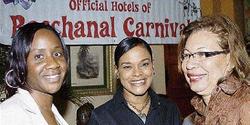 Charmaine Franklin (right), of Bacchanal Jamaica with Annette Carrington-Jackson (centre) and Carlene Edwards both of the Acropolis share the spotlight at last Thursday's media launch of Bacchanal Jamaica Carnival 2008, at Knutsford Court Hotel, Ruthven Road, St. Andrew. - Winston Sill/Freelance Photographer