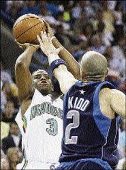 New Orleans Hornets' guard Chris Paul (left) shoots over Dallas Mavericks' guard Jason Kidd in Game Two of the NBA play-off series on Tuesday night. The Hornets won 127-103 to take a 2-0 lead in the series. - AP