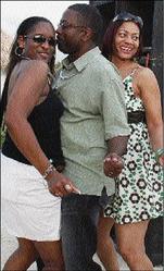 It's a bird, it's a plane, it's a human sandwich as two Jamaica National lovelies, Atiya Stewart (left) and Suzette Muirhead, put Keith Miller at the heart of the matter at the first in a series of four 'Island Escape' parties as part of a staff incentive programme, which recognises outstanding performance among employees at the branch level. Over 350 staff and their guests converged on Sandals Cay, in Montego Bay, last Saturday. - Photo by Janet Silvera