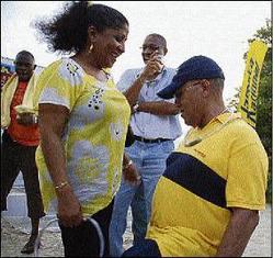 Getting down as low as he can, Jamaica National's corporate secretary, Byron Ward, shows executive mortgage officer, Wanica Purkiss, a thing or two on the sand. - Photo by Janet Silvera