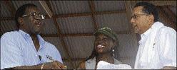 Neville Hinds (left) and Tony Cohen, from Byron Lee and the Dragonnaires, give Jennifer 'Jenny Jenny' Small something to laugh about at Bigga Little Ochie Seafood Carnival on Sunday. - photo by Denise Reid