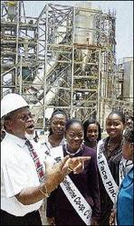 Silvera Castro, of Carib Cement, tells the finalists in the Festival Queen contest all they need to know about cement during a tour of the Caribbean Cement Company's new plant, yesterday. - Rudolph Brown/Chief Photographer