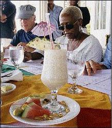 The inspiration behind Blackwell Fine Jamaican Rum, Chris Blackwell (seated left), and Carlene Walters, from J. Wray and Nephew Limited, make notes on a newly created, blended concoction in the Blackwell Rum Challenge, during a sampling at Ochi Passa Passa, recently. - Contributed PHOTOS