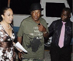 Tito Jackson of the once popular Jackson Five hugs Paula Surtees (left) of Strawberry Hill and Olivia 'Babsy' Grange, minister of youth, sports and culture, following dinner at the Irish Town resort on Wednesday night. Jackson, who is scheduled to leave Jamaica today, performed at Reggae Sumfest last weekend and spent the night in Irish Town. - photos by Colin Hamilton/freelance photographer