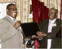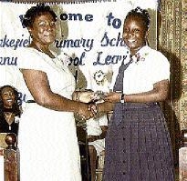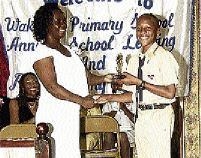 Khadeja Stewart, who was adjudged Wakefield Primary's top girl in GSAT, accepts an award from Marcia Roberts, one of two Teachers of the Year.