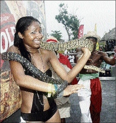 Snake charmer? This partygoer seems to have bitten off more than she could manage as she played with Gloria, a Jamaica boa, at Xtreme Wet 'n' Wild, a segment of the Red Stripe Dream Weekend held at Kool Runnings Water Park in Negril on Saturday. - Contributed
