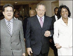 Prime Minister Bruce Golding (centre) arriving for yesterday morning's Private Sector Organisation of Jamaica (PSOJ) Chairman's Forum at The Jamaica Pegasus hotel in New Kingston. He was met by PSOJ President Joseph Matalon and CEO of the PSOJ, Sandra Glasgow. - Contributed