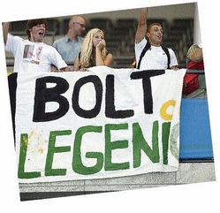 Usain Bolt's fans (some from other countries) cheer for the athlete.