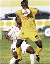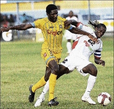 Left: Waterhouse striker Kevin Lamey jumps to control the ball on his chest ahead of Arnett Gardens defender Rasheed Clarke during the Digicel Premier League football match at Drewsland Mini Stadium yesterday. Waterhouse won 2-0.