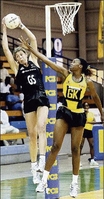 New Zealand's goal shooter Irene Van Dyk catches the ball while she is defended by Jamaica's goalkeeper, Nicole Aiken, during the second Test of the National Commercial Bank Sunshine Series at the National Indoor Sports Centre on Thursday.- Ricardo Makyn/Staff Photographer.