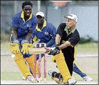Jamaica Masters batsman Jimmy Adams sweeps as Kingston and St Andrew Titans wicketkeeper, Shane Harris, react during the Red Stripe Twenty20 cricket match at Chedwin Park. - Ian Allen/Photographer