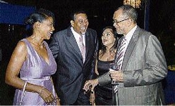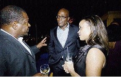 Former big boss at FirstCaribbean, Milton Brady (left, now at LIME), hobnobs with the bank's CFO, Lancelot Leslie, and Michelle Campbell, head of technical support.