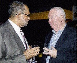 FirstCaribbean (Jamaica) boss Clovis Metcalfe (left) 'holds a reason' with former director of the bank, Chris Bovell.
