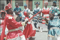 Members of the Manchioneal Cultural Group demonstrate "Bruckins", a traditional Jamaican dance, during an impromptu performance at the Manchioneal All-Age School, east Portland.