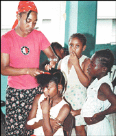 Nordia Blackwood, a missionary of the Institute of Caribbean Missions combs the hair of one of the students of the Visions of Hope. - Carlington Wilmot