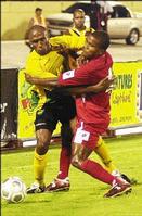 Jamaica's Ricardo Fuller grapples with Panama's Luis Henriquez during their first leg World Cup qualifying match at the National Stadium on September 4. Panama won 2-1.