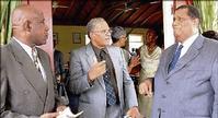 Astil Sangster (centre), president of West End Cane farmers Association, makes a point to Agriculture and Land Minister Roger Clarke (right) after a church service at the St. Patrick's Methodist Church in Truro, Westmoreland, to mark the opening of Sugar Week. Aston Smith, operations manager at Frome Division of the Sugar Company of Jamaica, looks on. - DALTON LAING PHOTO