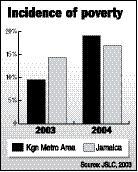 Poverty in the Kingston Metropolitan (KMA) jumped 50 per cent in 2004 even as the number of poor people across Jamaica dropped that year by two percentage points to 16.9 per cent, reflecting an overall 11.5 per cent decline in poverty levels...
