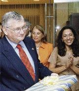 Left: A solemn looking Claudio Valle, departing Canadian High Commissioner, accepts a gift from his diplomatic colleagues. Looking on are Fanny Pino (left) and the Cuban Ambassador Gisela Garcia. Right: