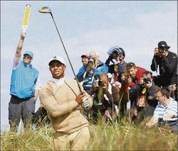 CARNOUSTIE, Scotland (AP): INSTEAD OF charging, Tiger Woods got in trouble on his first swing of the day at the British Open and slipped to seven off the lead after a three-over 74 yesterday at Carnoustie.