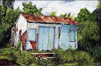 Allen's portrayal of old buildings, some nestled in rural Jamaica with wattle and daub beginning to peel apart, others such as 'Old Falmouth House' with detailed fretwork and verandah surrounding the upper floor, is enclosed by crotons as a yellow fence welcomes the viewer home. His love for old buildings can be observed in the way he applies the acrylic to canvas, whether it's brick, wood or rusting zinc, wattle or daub.