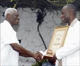 RIGHT: Cartoonist Las May (right) receives the Master of Craft award and a trophy from painting master Alexander Cooper last Sunday. Anthea McGibbon, Gleaner Writer