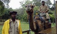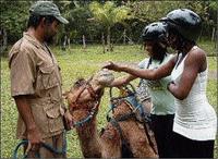 The rain was now coming in torrents and we erased any hopes of the promised 'camel trek' from our minds. But, surprisingly, there they were, waiting for us; the camels 'Betsy' and 'Katie' along with their trainers Alex Rosabal and Peter Allen. They inspired us to brave the cold and wet and climb into the saddle. We rode the animals on a sand trail designed to mimic the animals' native environment, their feet too delicate for stones.