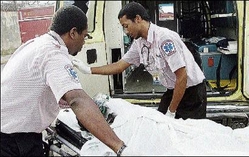 Emergency medical technicians prepare to carry away a fire victim from the Cool Petroleum Ltd fuel depot on Sunday. - Rudolph Brown/Chief Photographer