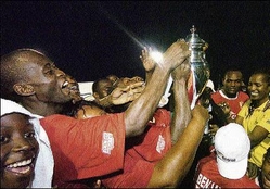 Boys' Town players celebrate winning the Flow Champions Cup, following their 3-0 win over Tivoli Gardens in the KO final at the Anthony Spaulding Sports Complex yesterday. - Ricardo Makyn/Staff Photographer.