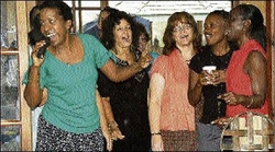 Karen Smith (left), leads a singalong with members of the American Women's Group at yesterday's annual general meeting at 6 Long Lane, Stony Hill, St Andrew. - Photos by Colin Hamilton/freelance photographer