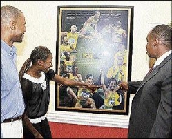 From left Bruce James, president, MVP Track and Field Club; Melaine Walker, Olympian; and Patrick Hylton, National Commercial Bank group managing director; check out a portrait of the club's athletes. The portrait was a gift given to the bank by the club for its support over the years. - Contributed