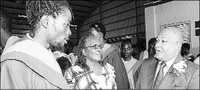 Permanent Secretary in the Ministry National Security, Mayor Richard Reese (right), has words of encouragement for graduate Daniel Barnes at the recent Citizen Security and Justice Programme (CSJP) graduation ceremony. Administrator for the CSJP, Mrs Sarah Newland-Martin, is at centre.